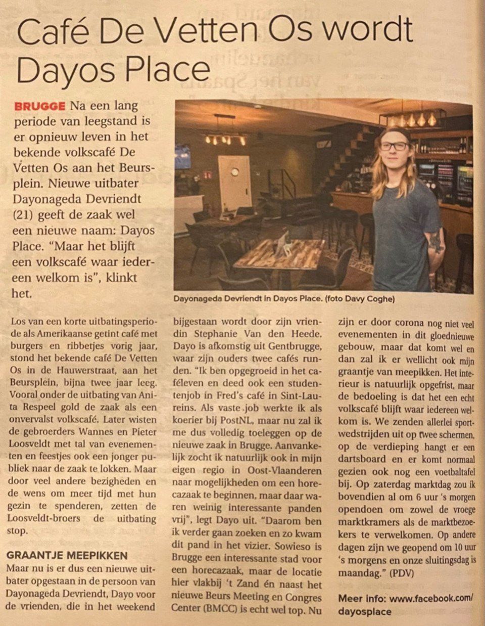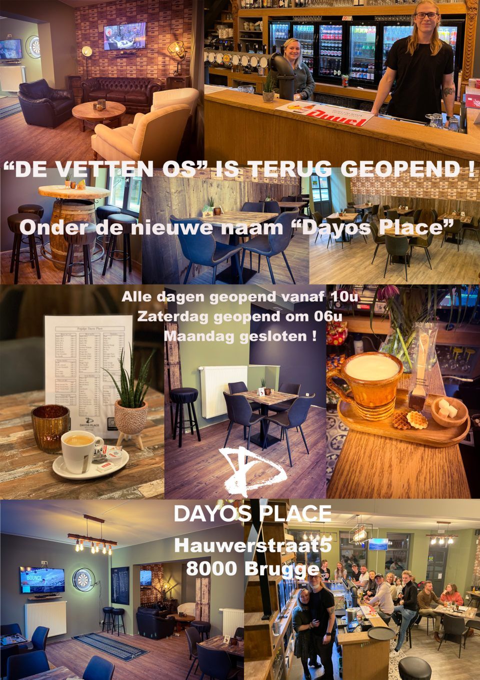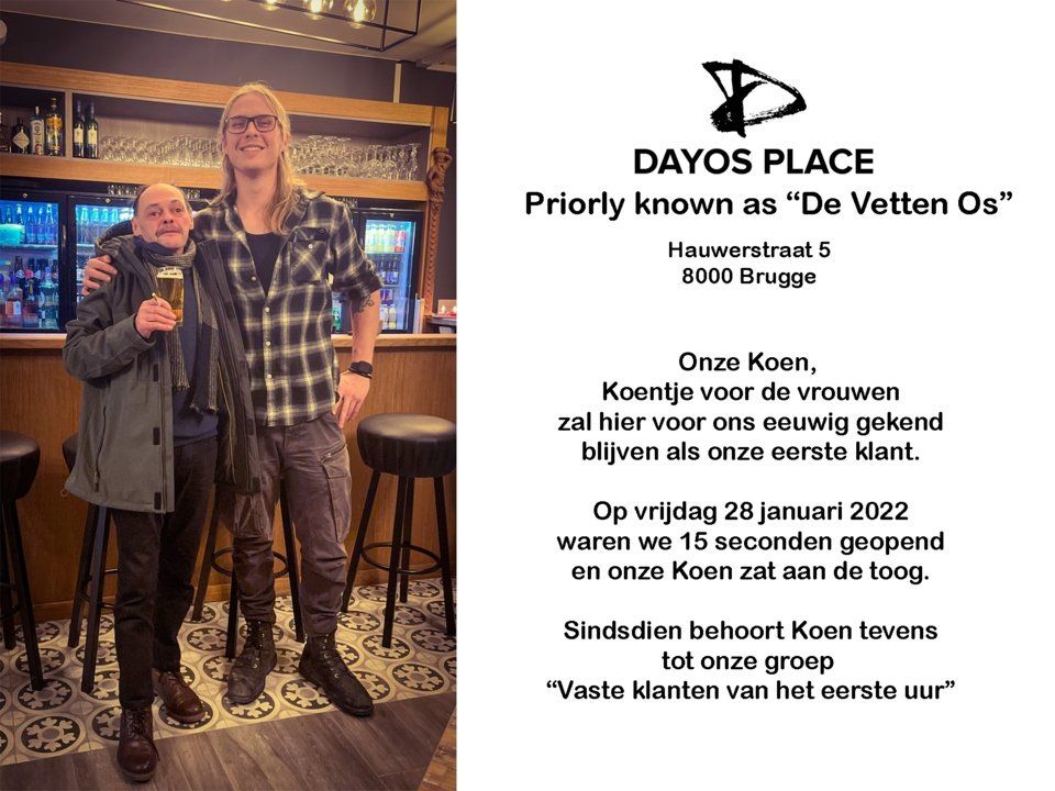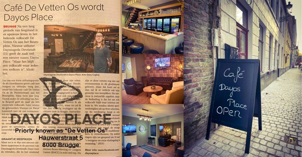 Welkom op de officiële website van Dayos Place (priorly known as "De Vetten Os"). Hét authentieke volkscafé van Brugge is terug! Weliswaar onder een nieuwe naam en onder leiding van nieuwe uitbaters, maar het pand aan het Beursplein waar De Vetten Os jarenlang furore maakte kan zich opmaken voor een nieuw avontuur. Café Dayos Place is en blijft voor iedereen het volkscafé bij uitstek in het centrum van Brugge! Wel met onze eigen touch en daar zijn we fier op.
